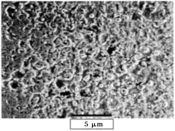 高頻電蝕與常規(guī)電蝕的現(xiàn)象相同,即旋轉(zhuǎn)期間電流流過(guò)套圈和滾動(dòng)體間的接觸區(qū),使接觸表面發(fā)生部分熔化,變得粗糙。在明顯電蝕的情況下偶爾也出現(xiàn)緞狀表面或波紋狀磨損,稱為脊?fàn)钣『刍蛲呃悴?/span>(下文稱為脊痕)。高頻電蝕特指由變頻設(shè)備高頻噪聲帶來(lái)的軸承損傷,定義為安裝在變頻控制旋轉(zhuǎn)設(shè)備(電動(dòng)機(jī)等)或靠近變頻控制設(shè)備附件的旋轉(zhuǎn)設(shè)備中的軸承產(chǎn)生的現(xiàn)象。圖1為由高頻電蝕在變頻驅(qū)動(dòng)風(fēng)扇電機(jī)軸承上引起的脊痕。稱之為脊痕的粗糙峰發(fā)生在一套軸承滾動(dòng)體數(shù)的整數(shù)倍的位置處,因滾動(dòng)體滾過(guò)這樣的粗糙表面而引起非常大的噪聲和振動(dòng),導(dǎo)致旋轉(zhuǎn)設(shè)備噪聲增大、可靠性降低。圖2為脊痕的掃描電鏡( SEM)照片,觀察到大量微小放電印痕,且已證實(shí)滾動(dòng)體滾過(guò)引起某些特征發(fā)生變形。