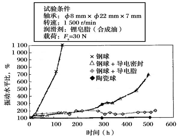 高頻電蝕抑制或防止措施的幾種方法的試驗(yàn)驗(yàn)證結(jié)果如圖3所示。與裝有正常鋼球的軸承相比,預(yù)填導(dǎo)電脂的軸承或配有導(dǎo)電密封的軸承減小了高頻電蝕損傷(振動(dòng)增加),但難以徹底避免這種損傷,在試驗(yàn)后檢測(cè)軸承內(nèi)部仍觀察到高頻電蝕損傷。因?yàn)檠b有陶瓷球的軸承不傳導(dǎo)高頻電流,軸承振動(dòng)極少上升,且試驗(yàn)后檢測(cè)軸承內(nèi)部未觀察到高頻電蝕損傷。