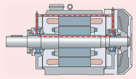 在定子繞組的三相之間,共模干擾產(chǎn)生不對(duì)稱電流,圍繞定子周圍的電流總和不為0。圍繞軸的高頻流變化產(chǎn)生了高頻軸電壓。因此,軸向流動(dòng)的電流很危險(xiǎn),該電流可穿過(guò)轉(zhuǎn)子軸、軸承、定子以及后面的其他軸承(圖5)。