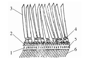 1—致密層;2—過渡層;3—柱狀層;4—基體;5—斷裂區(qū);6—有效潤滑膜厚