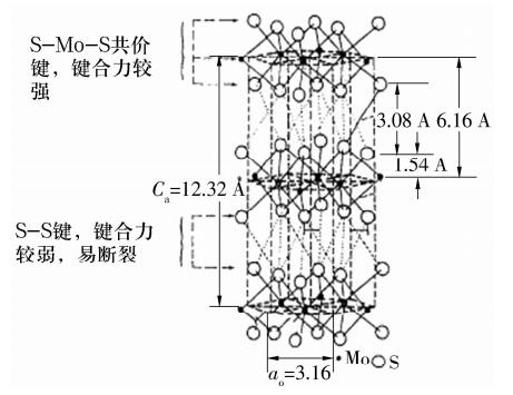 MoS2為具有高度各向異性的六方晶系層狀結(jié)構(gòu),由兩層硫原子和夾在其中的一層鉬原子組成(圖2)。每個鉬原子被處于三棱柱角上的六個等距離的硫原子包圍,鉬原子與硫原子層間距離為0.154nm,而硫?qū)娱g的厚度為0.308nm。鉬原子與硫原子以共價(jià)鍵結(jié)合,具有非常強(qiáng)的鍵合力,但硫原子層的層間結(jié)合力非常弱,表現(xiàn)為范德華力。因此,MoS2晶體容易沿范德華力作用區(qū)域劈開,起到潤滑效果。