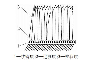 MoS2固體潤滑膜微觀生長機(jī)制按膜厚分為:致密層,過渡層,柱狀層,如圖1所示。