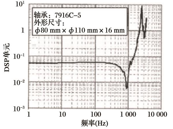 當轉(zhuǎn)速為5 000 r/ min,且主軸在徑向振動時的動態(tài)剛度測量實例如圖2所示。X軸為輸入頻率,Y軸為量綱一的剛度。當頻率為900 Hz左右時剛度降低,并能確定主軸在徑向的一維固有頻率。