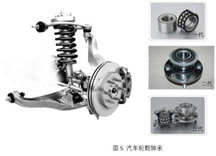 隨著汽車整體性能的提高,輪轂軸承的壽命、強度、剛度和免維護的要求日益嚴格,以及人們越來越體會到輕量化、可靠性、多功能和模塊化的重要性,汽車輪轂軸承正朝著高度集成化的方向發(fā)展。汽車輪轂軸承單元由最初的套圈鎖緊型和保持架鎖緊型單元(第一代),發(fā)展到外圈帶法蘭盤的第二代,再到大填球角壓配內(nèi)圈也帶法蘭盤的第三代,可將帶有ABS的傳感器與法蘭盤等集成為一體,如圖5所示。它們均為雙列球軸承,用以承受包含整個車身的更大載荷,我公司現(xiàn)有車型中多數(shù)前輪輪轂軸承采用第一代,后輪采用第三代。例如,某車型輪轂軸承的內(nèi)外圈及鋼球材料均為GCr15,法蘭盤材料為S55C,螺栓材料為SCM435,保持架為尼龍PA66+25%GF,組合式密封圈為NBR+SPCC/NBR+SUS430。