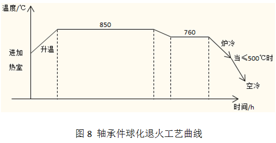 球化退火設備通常使用保護氣氛爐,使退火后的零件表面少、無氧化,并能提高軸承零件的材料利用率。軸承材料的加熱溫度為835~850℃,球化溫度為750~760℃,如圖8所示。