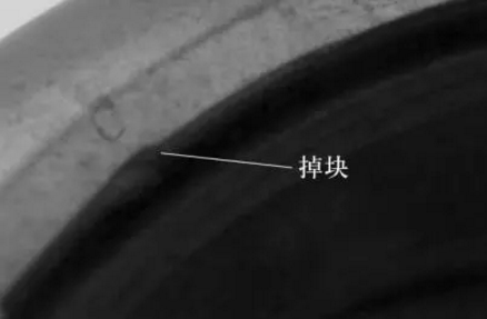 裝配質(zhì)量缺陷包括人為因素導(dǎo)致的磕碰傷或擠壓傷,裝配工藝不當(dāng)導(dǎo)致套圈局部受力較大,產(chǎn)生變形甚至斷裂,套圈保管或操作不規(guī)范會(huì)引起腐蝕及異物污染等。除裝配工藝不當(dāng)外,裝配質(zhì)量缺陷多為人為因素,而這是可以避免的。裝配過(guò)程中外圈局部掉塊如圖14所示。