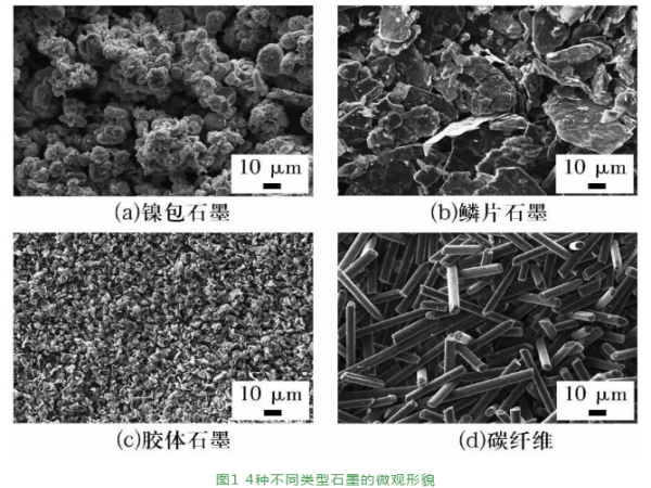 4種類型的石墨在掃描電子顯微鏡下的微觀形貌如圖1所示,由圖可知:采用濕法氫還原工藝制備的鎳包石墨(圖1a) ,在石墨顆粒外部包裹一層鎳形成具有核-殼結構的復合顆粒材料;鱗片石墨(圖1b)則呈鮮明的片狀結構且片層很薄,小于1μm,具有明顯的定向排列,層與層之間合力較弱,片層之間極易剝離;由于膠體石墨(圖1c)由2μm以下的顆粒形成,比其他3種石墨顆粒細小,且石墨顆粒均勻分布在有機溶劑中;碳纖維(圖1d)呈現(xiàn)棒狀形貌,其長徑比約為1:10~ 1:20。