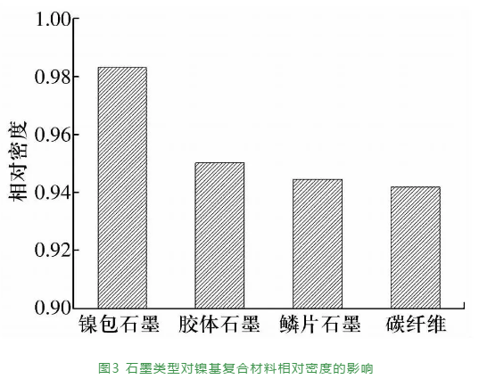先稱量電解鎳粉、還原銅粉,然后分別加入相同石墨含量的鎳包石墨、膠體石墨、鱗片石墨粉末和碳纖維,得到4種石墨類型的混合粉末。采用冷等靜壓成形,壓制壓力200 MPa,保壓180 s;成形坯體采用1200℃真空燒結后再經(jīng)500 MPa壓力復壓;最后采用800℃真空退火獲得最終的鎳基復合材料。