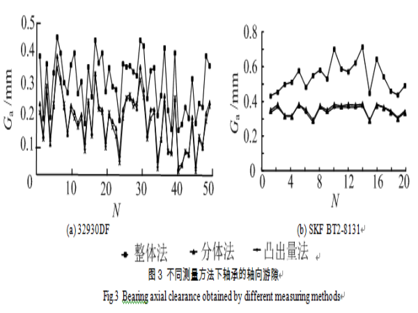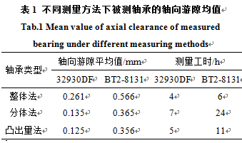 3種測(cè)量方法所測(cè)數(shù)據(jù)如圖3所示,50套32930DF和20套SKF BT2-8131在不同測(cè)量方法下的軸向游隙均值見(jiàn)表1。由圖、表可知: