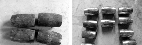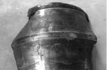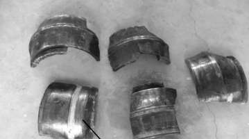 此調(diào)心滾子軸承在運轉(zhuǎn)過程中導(dǎo)致嚴(yán)重?fù)p壞,內(nèi)圈表面嚴(yán)重?zé)齻?,最終導(dǎo)致軸承失效,無法使用。圖1為此軸承的整體外圈,圖2為此軸承內(nèi)圈碎片及軸套外觀,圖3位此軸承的滾子表面圖,圖4為此軸承的保持架。