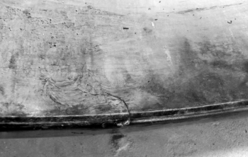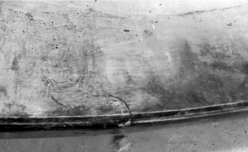 4塊內(nèi)圈碎片的表面損壞特征基本相同,取其中一塊進(jìn)行檢驗。一裂紋橫穿下滾道( 以圖片上下方向分為上滾道和下滾道) 表面至中間擋邊,在下滾道表面輾壓變形痕跡偏向擋邊;上滾道表面發(fā)黑,有燒傷現(xiàn)象和剝落坑,并有間距約58 mm,寬約 17 mm 長短不一的擠壓變形痕跡,如圖 7 所示。