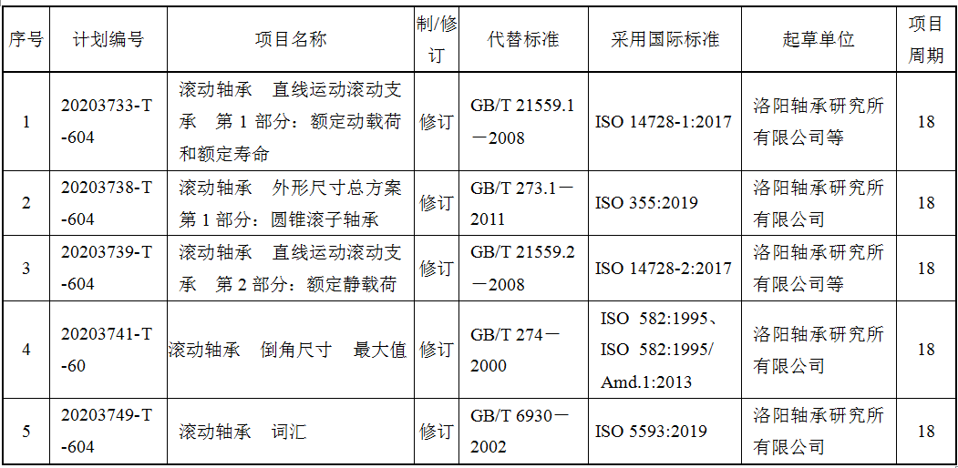 2020年11月19日,國家標準化管理委員會以國標委發(fā)[2020]48號文下達了2020年第三批國家標準制修訂計劃。本批共安排計劃531項,其中制定371項,修訂160項;推薦性標準524項,指導性技術文件7項。本次計劃中屬于滾動軸承領域的共5項,如下表所示: