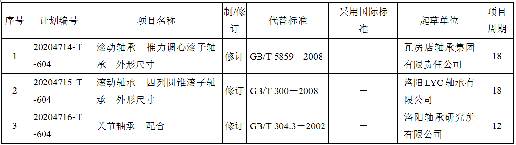 2020年12月24日,國家標準化管理委員會以國標委發(fā)[2020]53號文下達了2020年第四批國家標準制修訂計劃。本批共安排計劃524項,其中制定340項,修訂184項;推薦性標準517項,指導性技術文件7項。本次計劃中屬于滾動軸承領域的共3項,如下表所示: