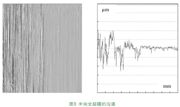 軸承生產(chǎn)中的質(zhì)量保證需要精密測量,目的是在大批量和短周期生產(chǎn)時(shí)滿足最嚴(yán)格的公差。由于實(shí)驗(yàn)室測量費(fèi)用高,例如到實(shí)驗(yàn)室的步行距離長且測量周期長,傳統(tǒng)的測量方法只能通過測量樣品來監(jiān)測過程,生產(chǎn)過程中的隨機(jī)誤差極易被忽略。因此,100%在線過程監(jiān)測將成為主要優(yōu)勢。用于100%監(jiān)測外圈滾道的在線集成測試機(jī)中的散射光傳感器如圖7所示。散射光傳感器可測量滾道的形狀、波紋度和表面粗糙度。在球軸承的成批生產(chǎn)中可能出現(xiàn)的典型故障和未完全超精的溝道實(shí)例如圖8所示。