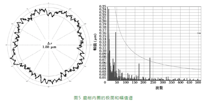 滾動軸承行業(yè)通常在一種理想條件下,在精密測量室里用形貌儀測量形狀和波紋度。這種測量在生產(chǎn)環(huán)境的應(yīng)用是不可取的,因?yàn)榄h(huán)境振動會使測量結(jié)果失真。這些畸變的測量極易導(dǎo)致代價(jià)昂貴的誤讀。最大圓度偏差為1.88μm的磨削內(nèi)圈的形狀輪廓如圖5所示,主要由長波部分主導(dǎo)。使用低通濾波器消除了高頻成分(波紋度和表面粗糙度),計(jì)算圓度或Δr。