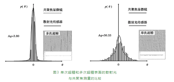 式中:θ-為第一統(tǒng)計(jì)動差,且為射線束的平均散射角;p(2θi)為一個(gè)角類的標(biāo)準(zhǔn)化單一概率。單次超精和多次超精表面的標(biāo)準(zhǔn)化分布如圖3所示。使用(3)式計(jì)算得到Aq =3.80(對于多次超精表面)和Aq =30.33(對于單次超精表面)。共聚焦顯微鏡的計(jì)數(shù)測量顯示了顯著的相關(guān)性。