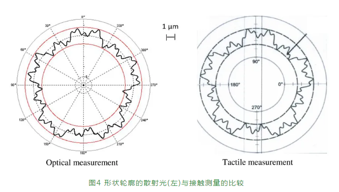 散射光法還可評估表面宏觀形貌(形狀輪廓)。因此,代表局部梯度的θ-是形狀輪廓的派生參量。形成的2種形狀輪廓測量值的比較如圖4所示,左邊是光學(xué)測量,右邊是接觸測量。這2種測量方法有明顯的相關(guān)性。