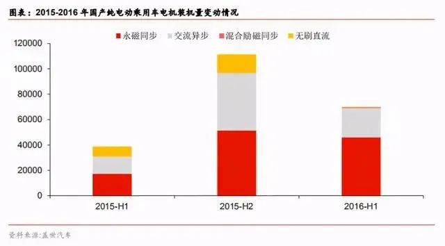 由于我國稀土資源豐富,因此電動乘用車多采用功率性能高、體積較小的永磁同步電機(jī)。根據(jù)中國汽車工業(yè)協(xié)會統(tǒng)計數(shù)據(jù),2016年上半年,我國純電動汽車產(chǎn)銷量分別達(dá)到13.4萬輛、12.6萬輛,同比分別增長160.8%、161.6%。上半年生產(chǎn)純電動乘用車約70000輛,其中永磁同步電機(jī)的裝機(jī)占比約為65.7%,比2015年同期增長21.25個百分點,比2015年全年增長了19.99個百分點。同期,國產(chǎn)新能源乘用車用交流異步電機(jī)的市場分額在逐漸減小,從2015年上半年的35.1%下滑至2016年上半年年的32.9%;而混合勵磁同步電機(jī)的占比則從0.03%上升至1.10%。