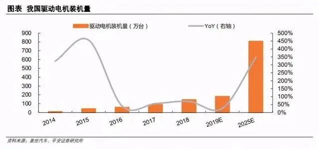 2018年我國新能源汽車銷量為125.6萬臺,預(yù)計至2025年,新能源汽車銷量將達(dá)到700萬臺,驅(qū)動電機(jī)的市場規(guī)模也隨之快速增長。數(shù)據(jù)顯示,2020年初全球新能源汽車電機(jī)電控市場規(guī)模約200億元,其中電機(jī)和電控的價值量比約4:6,即電機(jī)市場規(guī)模約80億元。而據(jù)此簡單測算,2025年全球新能源汽車電機(jī)市場規(guī)模有望提升至250億元,GAGR超20%。