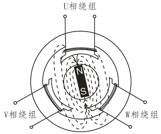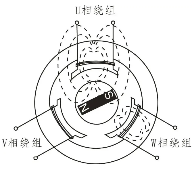北汽 EV160 永磁同步電機具有電動機和發(fā)電機的雙重功能。電動機工作原理是電機控制器分別控制 U 相、V 相和 W 相繞組,或者相鄰繞組的通電、斷電,在相應的繞組或相鄰的繞組中產(chǎn)生磁場,永磁轉子在磁場的作用下同步旋轉,如圖4所示。車輛減速時,永磁同步電機起到發(fā)電機的作用。交流發(fā)電機的工作原理是車輛減速時,驅動輪通過傳動裝置反拖永磁同步電機轉子運轉,旋轉的永久轉子磁場,分別切割 U、V、W 三相定子繞組,產(chǎn)生三相交流電,如圖5所示。