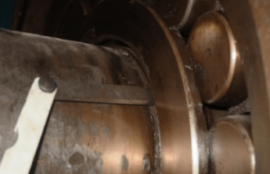 圖1、2表示減速機機殼軸承室與軸承外圈之間徑向間隙調整不當,造成的磨損。軸承與軸承室的配合。軸承外圈與軸承蓋之間為間隙配合,過緊會由于軸承轉動時發(fā)生熱膨脹造成軸承徑向間隙過小,太松則使轉動精度降低,轉動易跳動。故一般軸承外圈與軸承蓋之間有0.05-0. 10mm的徑向間隙,同時為保證轉軸受熱后的自由膨脹伸長,在軸承的推力與承力側,軸承與軸承室端蓋之間應留有足夠膨脹間隙。間隙與值與軸長有關。