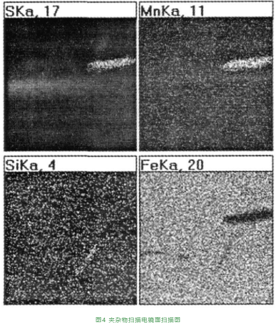 在金相觀察中選出待定夾雜物后,用電子探險針(EPMA)進行微區(qū)成分分析或者應用掃描電鏡(SEM)自帶能譜分析(EDS)進行成分分析。通??梢詼y定尺寸大于1μm的夾雜物的組成元素和大致成分,如果采用個別元素的面掃描還可以得到更為直觀的結(jié)果。圖4是使用掃描電鏡對Q460鋼中的一顆夾雜物進行的面分析圖譜,依次進行硫、錳、硅和鐵四種元素的面掃描,從掃描結(jié)果可以推斷出,明場觀察中夾雜物為MnS、SiO2和FeS,通過能譜儀(EDS)對其進行成分分析,還可直接得到各元素的質(zhì)量分數(shù)。