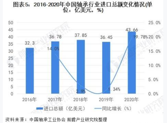 從進(jìn)口總額來看,2016-2020年中國軸承進(jìn)口金額,按照可比口徑,整體呈現(xiàn)逐年增長趨勢(shì)。到2020年,全國軸承進(jìn)口總額43.66億元,同比增長19.78%。