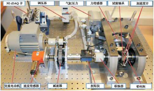 研究所用的軸承退化數(shù)據(jù)取自PRONOSTIA平臺(圖1),該試驗平臺用于測試和驗證滾動軸承診斷和預測方法。使用該數(shù)據(jù)集的權限取自IEEE PHM 2012委員會。由圖1可知,試驗平臺上安裝了2個加速度計,分別測量水平和垂直方向的振動信號。加速度計以10 s為間隔測量原始振動信號,采樣頻率為25.6 kHz,這意味著在10 s的間隔內有2 560個數(shù)據(jù)點可用。當振動信號幅值超過20g時,試驗軸承視為失效。