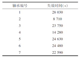 研究所用數(shù)據(jù)對應于7套軸承在1 800 r/min和4000 N的運行條件下的失效數(shù)據(jù)。每套軸承的失效時間見表1。所有這些軸承運行至失效,也就是缺陷并非預置到軸承中。因此,軸承可能由于任何一種可能的失效模式(如球、套圈、保持架或其組合) 而失效,因此,需識別數(shù)據(jù)中是否存在多種信息。