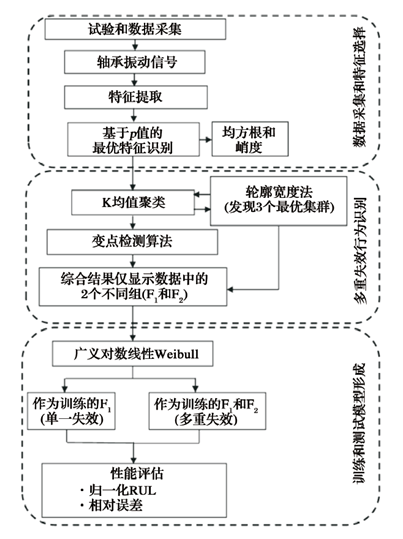 研究聚焦點是識別數(shù)據(jù)中的多重失效行為,并將這些信息與球軸承的RUL預測方法相結合。目前大多數(shù)診斷模型的工作都考慮了單一失效模式存在的假設,而Pradeep Kundu等研究提出了一種對具有多重失效模式的部件進行擴展式診斷分析的方法,而這一部件會導致數(shù)據(jù)中的多重失效行為。結果表明,K均值聚類算法和CPDA能很好地理解數(shù)據(jù)中可能出現(xiàn)的失效模式。這一理解對于準確預測軸承的RUL非常有用。目前工作獲得的結果有望為多重失效模式的診斷建模提供突破。