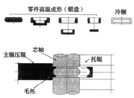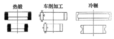 用熱鍛工藝制造環(huán)狀坯件,進(jìn)行球化退火、車(chē)削、噴丸清理之后,將磷化處理的坯料進(jìn)行冷鍛成形,這種情形下,能夠加工的零件尺寸有限,但易提高精度。另外,如進(jìn)行球化退火,則由于表面脫碳,需要有消除該脫碳層的加工。不過(guò),已有人提出了復(fù)碳退火減少車(chē)削余量的工藝。