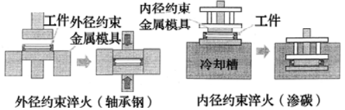 在熱處理的尺寸變化時(shí),利用該變化進(jìn)行約束淬火是降低熱處理變形的有效對(duì)策之一。軸承并不像齒輪那樣形狀復(fù)雜,由于形狀簡(jiǎn)單,一直在實(shí)施約束淬火,不過,約束淬火的熱處理成本比普通熱處理費(fèi)用高是有待解決的問題。