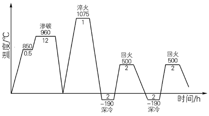 例如:文獻(xiàn)[2]對一種以馬氏體為基體的航空軸承鋼(Cr-Co-Mo系高溫軸承鋼)開展了真空低壓滲碳及滲碳后熱處理工藝研究,試驗(yàn)結(jié)果表明,試驗(yàn)鋼經(jīng)過“滲碳+淬火+深冷+回火+深冷+回火”后,得到了良好的組織性能,殘留奧氏體得到有效的控制、網(wǎng)狀碳化物得以消除、硬度梯度平緩且無“低頭”現(xiàn)象。通過馬氏體相變、碳化物的析出使得試驗(yàn)鋼的表面硬度相較于退火態(tài)初始硬度提高了20HRC。