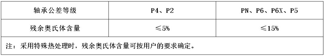 軸承鋼中殘余奧氏體的含量要根據(jù)其服役條件(應(yīng)用工況)來平衡,對尺寸精度、耐磨性要求高,可能需要冷處理等工序嚴(yán)格控制奧氏體的含量。GB/T 34891—2017《滾動軸承 高碳鉻軸承鋼零件 熱處理技術(shù)條件》規(guī)定的淬回火后的殘余奧氏體含量見下表。
