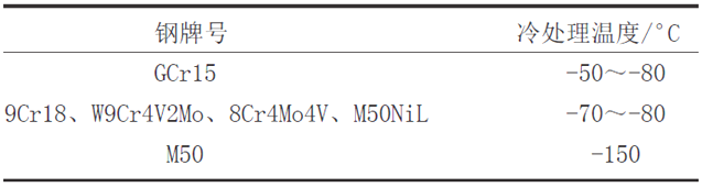 軸承鋼冷處理的學(xué)術(shù)研究上基本都是進(jìn)行深冷處理,文獻(xiàn)[4]給出的常用軸承零件的冷處理溫度見下表,因此,實(shí)際冷處理溫度還需要根據(jù)具體情況深入探討。