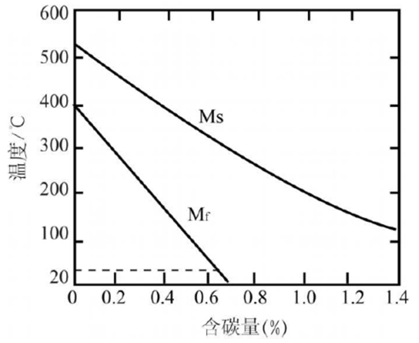圖1 鋼中馬氏體開始和終止轉(zhuǎn)變溫度和含碳量的關(guān)系