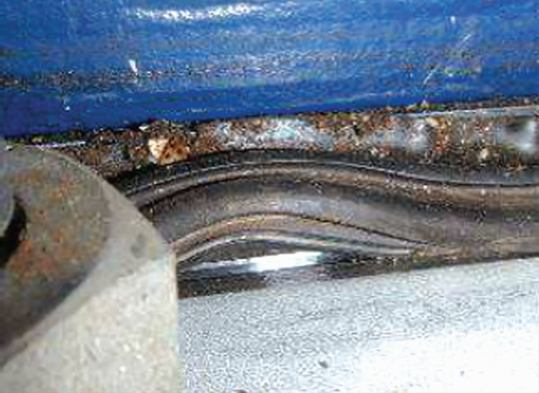 不按照工藝安裝或維護(hù)時會導(dǎo)致密封圈受力不均勻,安裝密封圈時接口粘接不良會導(dǎo)致密封圈接口斷裂,后續(xù)變槳軸承注脂運(yùn)行后密封圈容易出現(xiàn)鼓包、翹曲(圖1)和斷裂現(xiàn)象,從而使?jié)櫥瑥拿芊馊p隙、翹曲及破損處溢出。