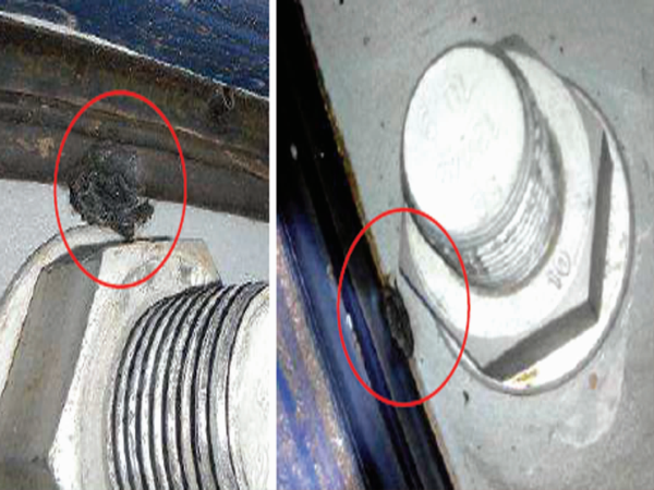 風(fēng)電機(jī)組的葉片安裝或維護(hù)時需要使用液壓拉伸器對葉片與變槳軸承的連接螺栓施加力矩,連接螺栓與密封圈的距離較近,且液壓拉伸器的拉伸頭外形尺寸較大,拉伸頭易壓到密封圈使密封圈嚴(yán)重破損,如圖2所示。變槳軸承后續(xù)運(yùn)行時可能會導(dǎo)致密封圈變形和撕裂,造成潤滑脂大量泄漏。