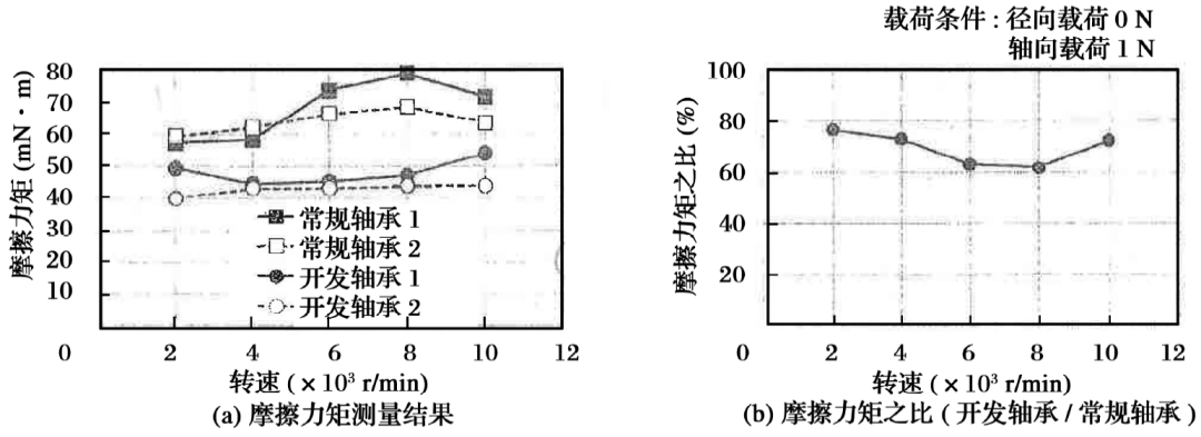 3)在整個(gè)轉(zhuǎn)速區(qū),使用開(kāi)發(fā)的新結(jié)構(gòu)保持架使輕軸向載荷作用下的摩擦力矩降低60%以上。
