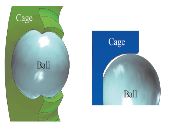 圖6 深溝球軸承的球與保持架接觸狀態(tài)(左-常規(guī);右-新開(kāi)發(fā))