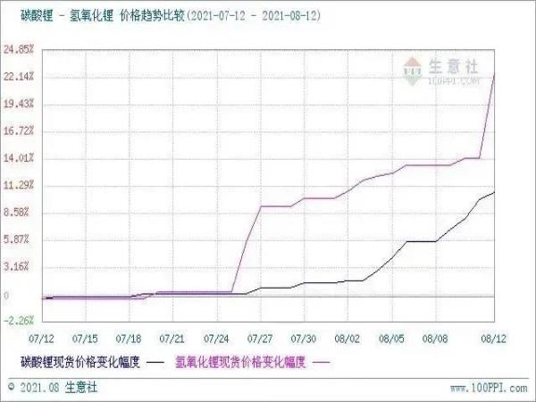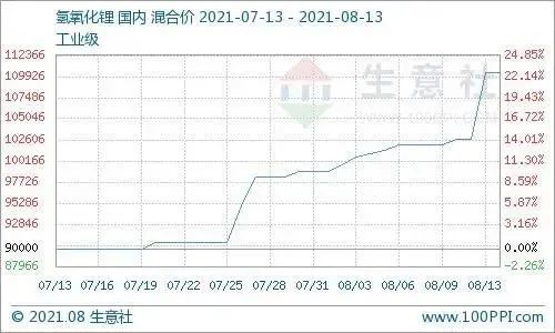 據(jù)生意社大宗榜數(shù)據(jù)顯示,截止到8月13日,國內(nèi)工業(yè)級氫氧化鋰企業(yè)均價為110333.33元/噸,與周一價格相比上漲了8.17%,與7月13日相比上漲了22.59%,以三個月為周期同比上漲27.80%。