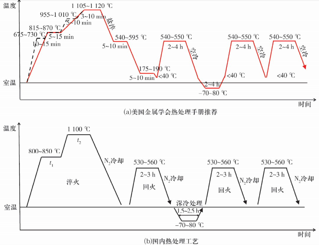 國(guó)內(nèi)外8Cr4Mo4V鋼傳統(tǒng)熱處理工藝均為淬火加三次回火,如圖1所示,區(qū)別在于國(guó)外淬火升溫過程為一步預(yù)熱(圖1a紅線)或三步預(yù)熱(圖1a黑色虛線),而國(guó)內(nèi)基本采用一步預(yù)熱(圖1b);國(guó)外淬火冷卻過程采用分級(jí)淬火方式,主要目的是減小熱處理變形,而國(guó)內(nèi)采用吹N2連續(xù)冷卻。