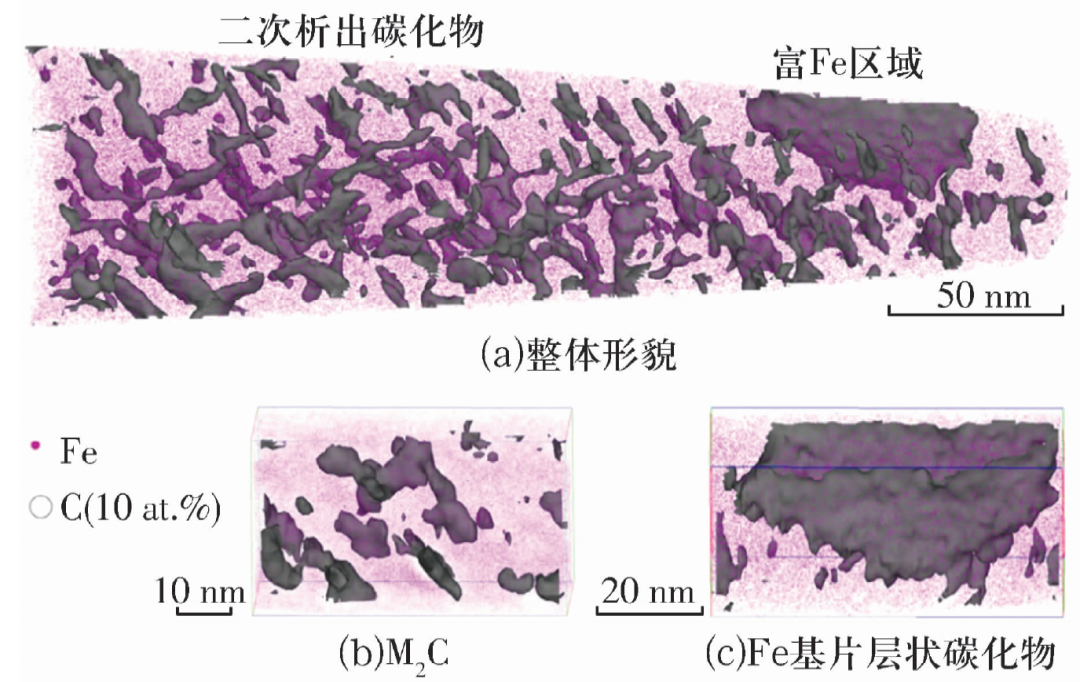 由文獻(xiàn)[8]可知,淬火未溶解碳化物的主要類型為M2C和MC,而回火析出碳化物主要類型為M23C6和M2C。通常,回火析出碳化物尺寸為納米級(jí),呈片狀或球狀,可起到二次硬化效果。然而,較早研究中受分析測(cè)試手段限制,只能從二維角度對(duì)8Cr4Mo4V鋼中碳化物進(jìn)行觀察分析,制樣以及觀察方式均可能導(dǎo)致對(duì)其真實(shí)形狀及尺寸存在誤判。隨著三維原子探針技術(shù)的開發(fā)及應(yīng)用,文獻(xiàn)[14]將其用于8Cr4Mo4V鋼中碳化物分析,結(jié)果如圖3所示,圖3b和圖3c為圖3a旋轉(zhuǎn)一定角度的局部放大,回火過程中析出的M2C三維形貌呈細(xì)柱狀,且連續(xù)彌散。