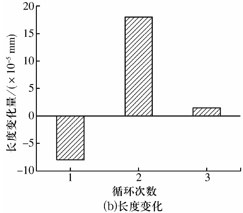 經(jīng)不同循環(huán)次數(shù)的穩(wěn)定化熱處理后,8Cr4Mo4V鋼( φ30 mm×20 mm)的殘余奧氏體含量及尺寸變化結(jié)果如圖6所示。由圖6a可知:正常熱處理后殘余奧氏體含量為2.61%,隨著尺寸穩(wěn)定化循環(huán)次數(shù)的增加,殘余奧氏體含量逐漸減少,經(jīng)3次循環(huán)后降低至0.76%。一次穩(wěn)定處理過程中馬氏體析出與殘余奧氏體轉(zhuǎn)變同時(shí)進(jìn)行,8Cr4Mo4V鋼尺寸整體呈收縮現(xiàn)象(圖6b),說(shuō)明起主要作用的因素為馬氏體析出;二次及三次穩(wěn)定處理時(shí),由于馬氏體析出反應(yīng)基本完成,殘余奧氏體向馬氏體轉(zhuǎn)變成為引起尺寸變化的主要因素,因此呈現(xiàn)膨脹現(xiàn)象,且隨著循環(huán)次數(shù)的增加,殘余奧氏體含量降低,尺寸膨脹量也隨之減小。由圖6b可知,經(jīng)三次循環(huán)處理后,8Cr4Mo4V鋼試樣長(zhǎng)度平均增加1.5X10-5 mm,變化率為7.5x10-7。