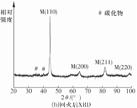 淬回火工藝處理后8Cr4Mo4V鋼微觀組織及物相如圖2所示:淬火后8Cr4Mo4V鋼的晶粒較為均勻、細(xì)小,回火后8Cr4Mo4V鋼由回火馬氏體、少量殘余奧氏體(體積分?jǐn)?shù)不大于3%)及碳化物組成;回火后存在無(wú)規(guī)則塊狀和彌散分布小顆粒狀碳化物,其中塊狀碳化物為淬火未溶解碳化物和回火析出碳化物。