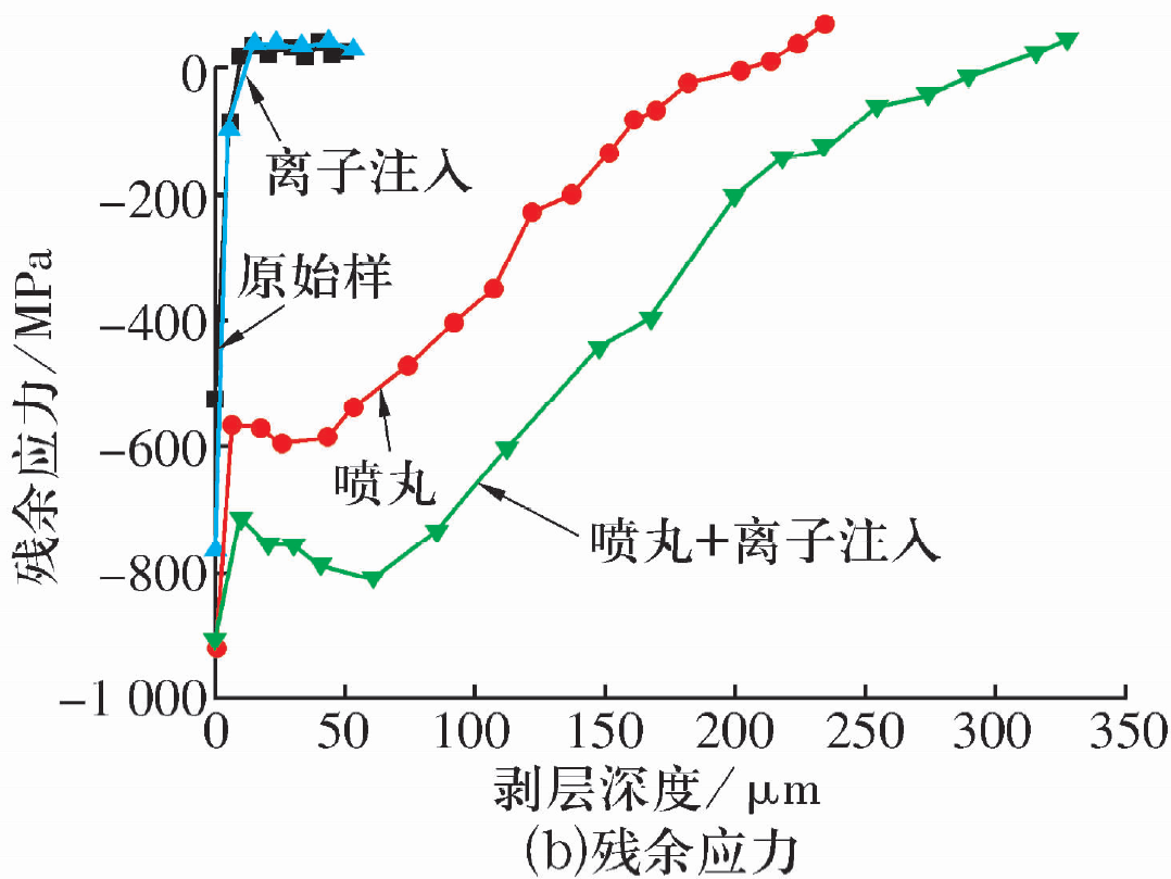 復(fù)合處理后8Cr4Mo4V鋼表面N元素分布和應(yīng)力梯度結(jié)果如圖15所示,單一離子注入處理后8Cr4Mo4V鋼改性層深度僅約5 μm,而復(fù)合處理后8Cr4Mo4V鋼表面氮濃度遠(yuǎn)高于僅離子注入試樣,且在30 μm處N原子數(shù)分?jǐn)?shù)仍超過10%;盡管單一離子注入處理對(duì)應(yīng)力幾乎無影響,但其與噴丸處理耦合時(shí)卻可以大幅增加壓應(yīng)力的幅值和深度。文獻(xiàn)[47]認(rèn)為這是由于噴丸產(chǎn)生的缺陷為N原子向試樣內(nèi)部快速擴(kuò)散提供了通道,而N原子以過飽和固溶體存在于晶格和缺陷中,使點(diǎn)陣膨脹形成附加壓應(yīng)力,提高了噴丸強(qiáng)化效果。