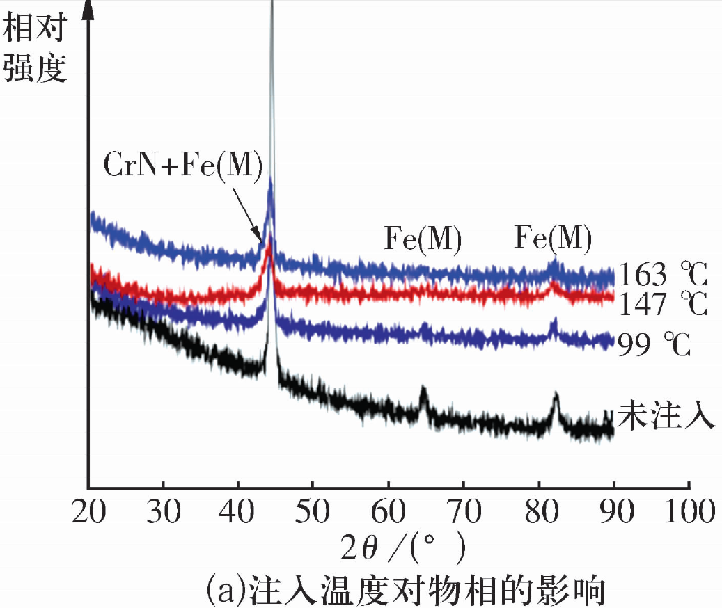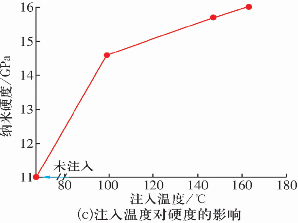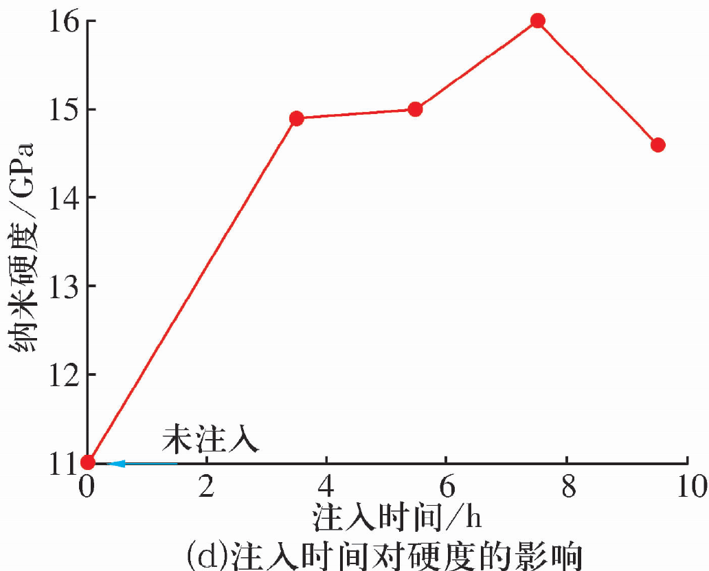 文獻(xiàn)[35]采用N元素等離子體離子注入技術(shù)對(duì)8Cr4Mo4V鋼進(jìn)行表面改性,獲得了厚度達(dá)22 μm的改性層,并深入研究離子注入?yún)?shù)對(duì)其組織、性能的影響規(guī)律及機(jī)制,結(jié)果如圖10所示,注入層的納米硬度相較于8Cr4Mo4V鋼基體可提高45%,可顯著提高材料的耐磨性能;且離子注入過程可在8Cr4Mo4V鋼表面引入一定的殘余壓應(yīng)力。