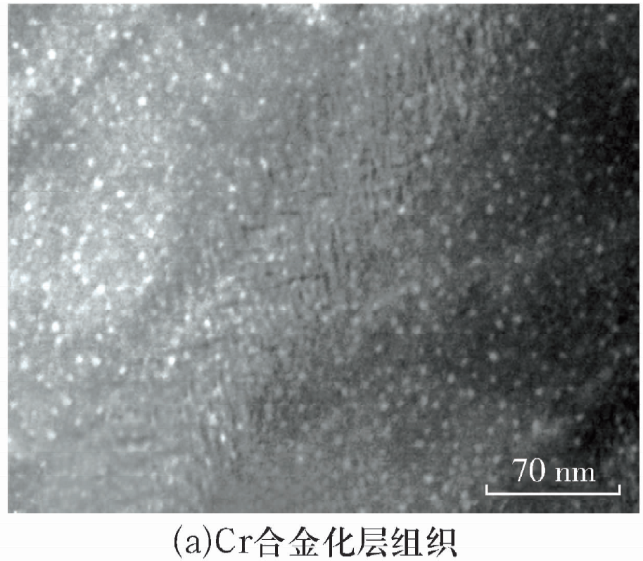 強(qiáng)流脈沖電子束表面合金化技術(shù)通常包括2個(gè)過程:首先在材料表面進(jìn)行鍍膜處理,然后利用高能電子束轟擊材料表面,從而改變材料表面熔化層,產(chǎn)生成分和組織結(jié)構(gòu)變化,提高材料表面的力學(xué)性能和耐蝕性[29]。文獻(xiàn)[30-33]利用電子束合金化技術(shù)分別在8Cr4Mo4V鋼表面制備了Cr和Ta合金化層。經(jīng)表面合金化和后續(xù)回火處理后,合金化層微觀組織及表面硬度如圖9所示:8Cr4Mo4V鋼表面析出大量尺寸僅有幾個(gè)納米的顆粒,由于納米顆粒析出強(qiáng)化效應(yīng),回火后Ta和Cr合金化層的最大硬度分別達(dá)到17.3,18.2 GPa,相較于基體的11 GPa,提高幅度達(dá)57%和65%。