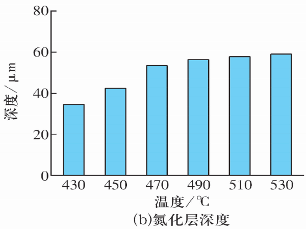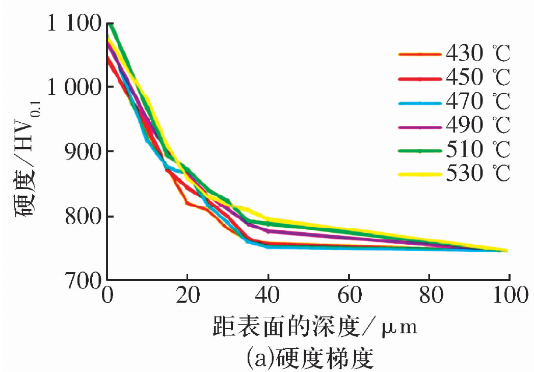 文獻(xiàn)[27]進(jìn)行了8Cr4Mo4V鋼離子滲氮研究工作,利用陽極層離子源輔助滲氮技術(shù)在不同溫度下進(jìn)行8Cr4Mo4V鋼氮化處理,材料表面硬度梯度及滲氮層深度如圖7a和圖7b所示。由圖7可知:隨著滲氮溫度的升高,滲氮試樣的表面硬度略微增加,最高表面硬度達(dá)1 100 HV0.1;滲氮溫度的升高使氮原子擴(kuò)散系數(shù)增加,導(dǎo)致530 ℃的滲層深度比430 ℃的增加了近一倍。但8Cr4Mo4V鋼氮化層深度較淺不能滿足8Cr4Mo4V鋼性能提升需求;進(jìn)行工藝改進(jìn)后,8Cr4Mo4V鋼氮化層深度達(dá)120 μum,這將大大提升8Cr4Mo4V鋼抗疲勞性能。