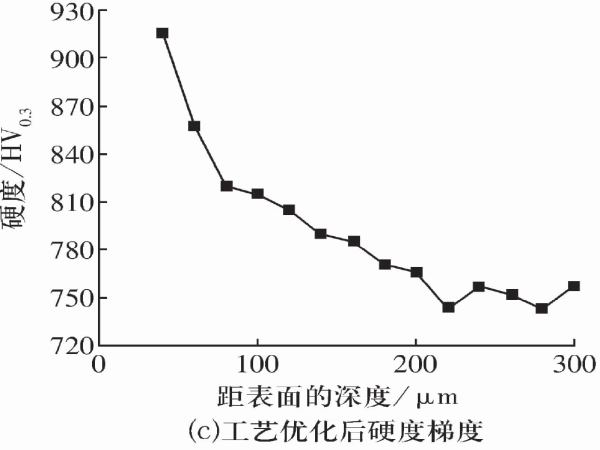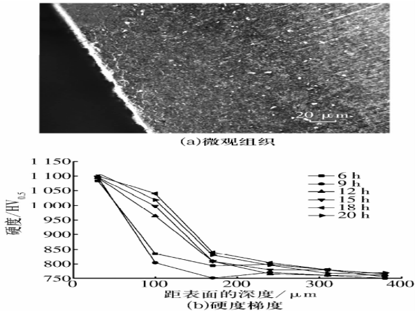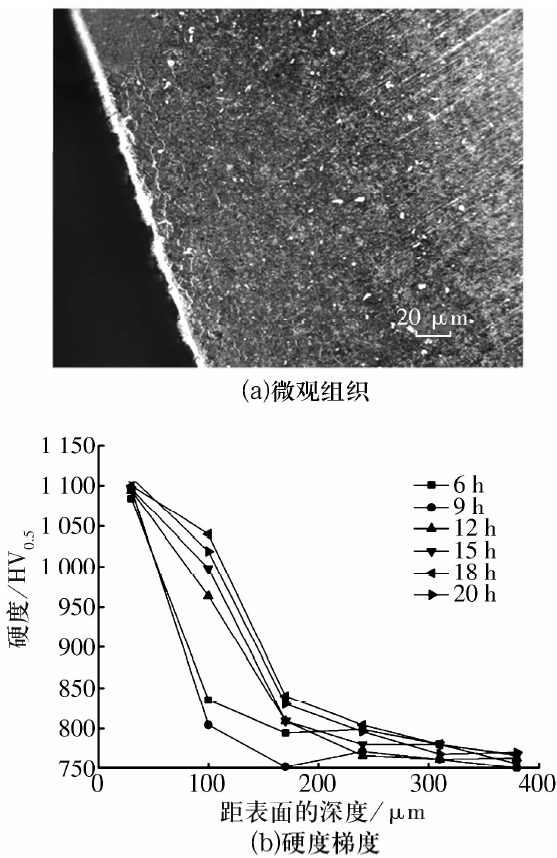 除真空離子氮化技術(shù)外,文獻(xiàn)[28]開展了8Cr4Mo4V鋼鹽浴氮化技術(shù)研究。氮化后其微觀組織形貌及硬度梯度如圖8所示,盡管8Cr4Mo4V鋼表面硬度得到了大幅度提升,但該氮化方式使其表面存在脆性的“白亮層”及脈狀組織,對(duì)材料性能可能產(chǎn)生不利影響。
